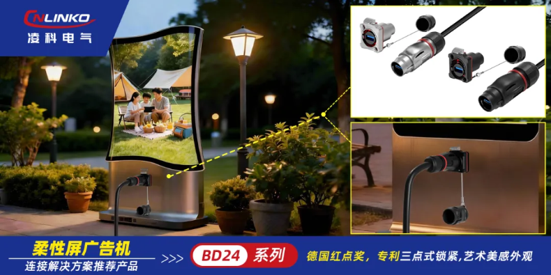 凌科BD24系列USB3.0工業(yè)連接器,符合工業(yè)級(jí)標(biāo)準(zhǔn)要求,專為應(yīng)對(duì)戶外復(fù)雜環(huán)境而設(shè)計(jì)。其卓越性能與可靠性,與柔性屏廣告機(jī)在戶外等嚴(yán)苛場(chǎng)景下的應(yīng)用需求高度契合,確保了數(shù)據(jù)傳輸?shù)母咚俜€(wěn)定與設(shè)備連接的持久耐用。