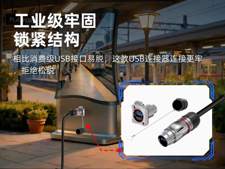 普通消費(fèi)級(jí)USB插頭很容易在外力下松脫或斷連,因而連接更為牢靠的工業(yè)級(jí)USB連接器非常必要。