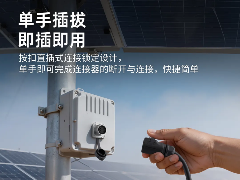 連接器的即插即用,單手操作特性,對于太陽能推拉桿設(shè)備非常具有吸引力,既提高操作效率和體驗感,而且對于后續(xù)維檢設(shè)備也是大有裨益。