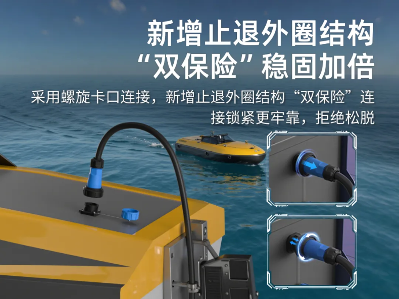 DL28工業(yè)連接器配備 “螺旋卡口+止退外圈”雙重鎖定結(jié)構(gòu),相比IEC60309插頭等連接器單一鎖定的傳統(tǒng)方案,其連接更為牢固可靠,抗振、抗沖擊、抗拉拔性能顯著提升,確保無(wú)人船航行中電氣連接穩(wěn)固無(wú)松動(dòng),保障設(shè)備連續(xù)安全運(yùn)行。