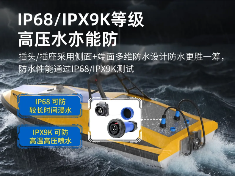 凌科DL28工業(yè)連接器采用端面與側(cè)面的多重防水密封設(shè)計(jì)(通過(guò)了IP68及IPX9K防水測(cè)試),能在無(wú)人船所處的高水液風(fēng)險(xiǎn)環(huán)境下確保連接部位滴水不進(jìn)、供電穩(wěn)定,杜絕因滲水導(dǎo)致的短路、腐蝕及設(shè)備損壞。