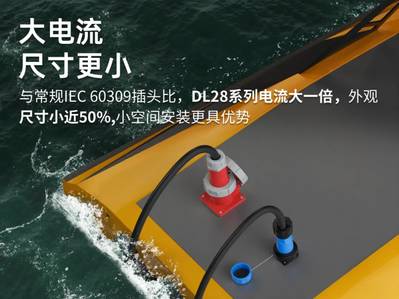 凌科DL28系列大電流連接器,其結(jié)構(gòu)緊湊,相對(duì)于IEC60309插頭,尺寸縮小近一半,顯著節(jié)省空間和減輕重量。有助于無(wú)人船優(yōu)化布線,減輕船體負(fù)載,提升整體性能和續(xù)航能力。